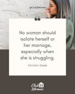 No woman should isolate herself or her marriage, especially when she is struggling. We need at least a couple of trusted people to confide in. Every marriage needs accountability. This is healthy. Marriage starts with two people but your marriage speaks to everyone around you, beginning with your children. Strange as it sounds, your marriage isn’t just about you and your spouse.