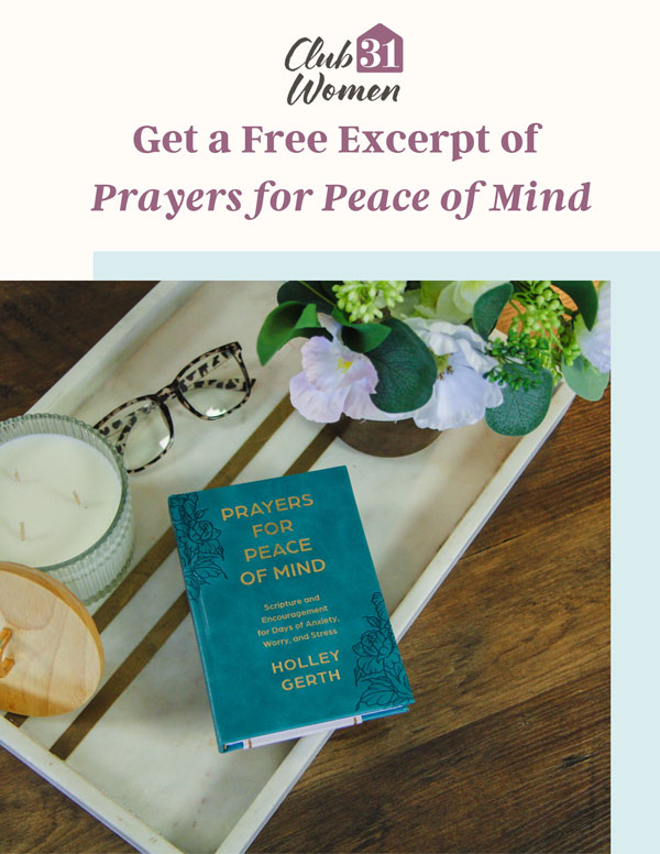 We’ll also send you an excerpt from Prayers for Peace of Mind by Holley Gerth, a beautiful collection of more than 100 prayers to give you a moment of calm in the midst of your chaos and worry.