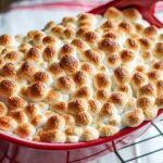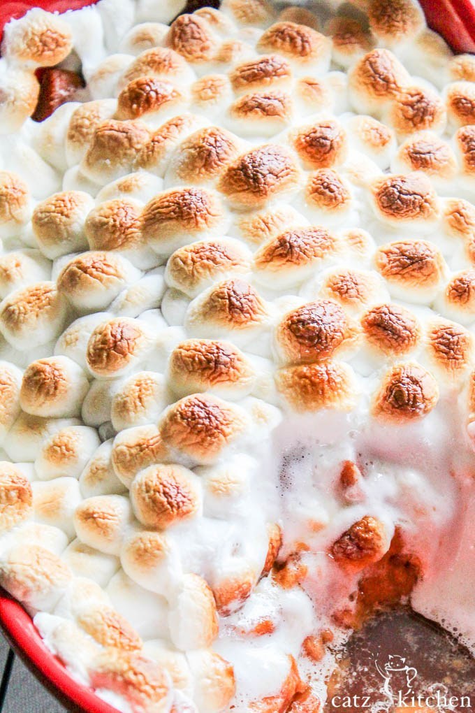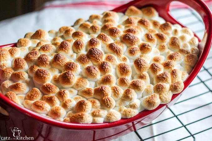 Remove the casserole dish from the oven and turn on the broil. Meanwhile, top the dish with mini marshmallows making sure there aren't any uncovered spots. Return dish to oven and broil for 3-5 minutes or until the marshmallows are toasted. DO NOT WALK AWAY!