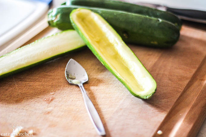 Hollow out the zucchini halves using a spoon, leaving a 1/4 inch thick shell on each.